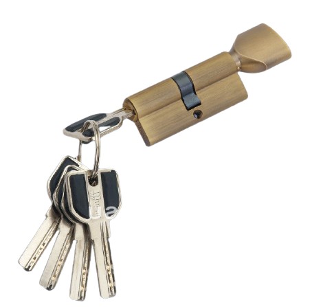 Латунный цииндр с 5-ю перфорированными ключами и поворотной вертушкой из латуни. Ключ и вертушка - полированная латунь. В закрытом состоянии поводок отклонен на 30 градусов, что обеспечивает дополнительную защиту от выбивания. Защита от высверливания. 7 пинов обеспечивают высокую секретность механизма.