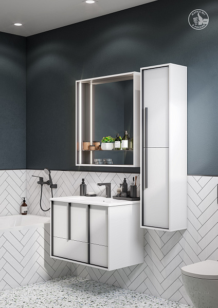 Корпус зеркального шкафа Ривьера 80 от бренда AQUATON выполнен из чёрной МДФ в белой матовой пленке, что позволяет создать яркий цветовой контраст чёрного и белого. Плёнка позволяет надежно защитить мебель от воздействия влажной среды ванной комнаты. В боковые стенки интегрированы LED-светильники. Зеркальный шкаф комплектуется полкой из затемнённого стекла с фиксаторами, которые помогут избежать случайного опрокидывания. Практичная и функциональная модель идеально дополнит тумбу под раковину AQUATON Ривьера 80.