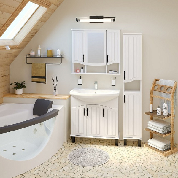 Тумба под умывальник напольная с тремя распашными фасадами и одной внутренней полкой. Петли со встроенным доводчиком, ручки черные - 3шт, ножки черные пластиковые - 4шт.