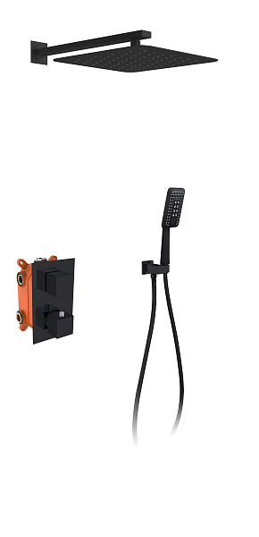 Комплектация: встраиваемый механизм, термостатический смеситель настенного монтажа, латунный двухрежимный ручной душ, гибкий металический шланг, верхний душ.