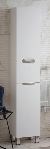 У напольного пенала 2 распашные двери, позади дверей - вкладные полки. По центру - 1 выдвижной ящик. Высота ящика - 200 мм. Все двери на петлях с доводчиками. Пенал является универсальным - может быть как правого, так и левого открывания путем его переворачивания. У пенала 4 металлические опоры. Фасады  - плёнка ПВХ Белая.