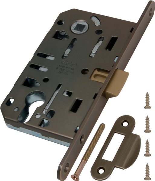 Замок межкомнатный под цилиндр в комплекте с ответной планкой. Блистерная упаковка. Цвет античная бронза. Защелка MEDIANA EVOLUTION с пластиковым язычком отличается бесшумностью при закрывании. Она разработанна инженерами компании AGB и объединяет в себе надежность, качество используемых материалов, точность механических соединений и инновации. Все замки серии Evolution имеют один размер и взаимозаменяемы между собой