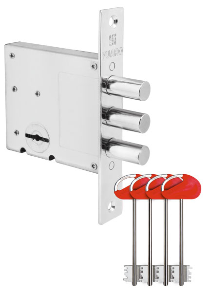 Замок врезной сувальдный Fuaro  V10/S-60.00.3R14 с тремя ригелями предназначен для установки во входные и технические металлические двери. Стальной оцинкованный корпус.  Универсальная установка, подходит для левых и правых дверей. Бэксет- 60 мм. Выход ригелей- 26 мм. Открывание-2 полуоборота. Диаметр ригелей -14 мм. В комплект входят:  4 ключа с эргономичной пластиковой головкой для дверей толщиной  40-120мм, крепежная фурнитура.