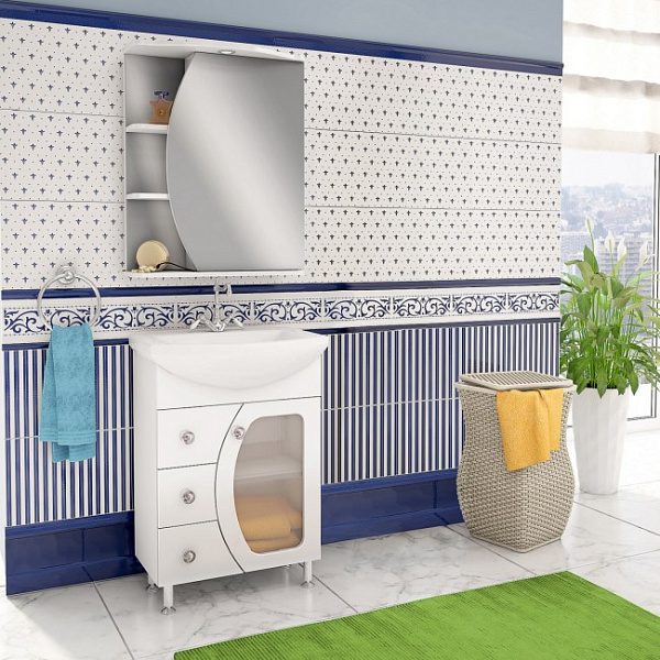 Зеркальный шкаф оборудован одним врезным светодиодным светильником 220В и розеткой с выключателем. Справа - шкаф с фигурной зеркальной дверцей и двумя внутренними полками, слева - две открытые полочки. Петли со встроенным доводчиком.