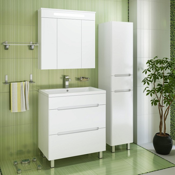 Зеркальный шкаф со встроенной сверху люминесцентной подсветкой и тремя отделениями с зеркальными фасадами. Внутри - две встроенные полки. Блок розетка/выключатель расположен внутри шкафа. Петли со встроенным доводчиком.