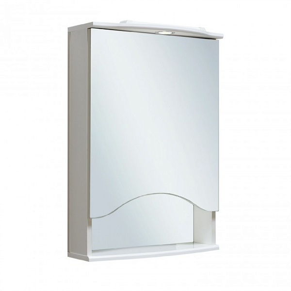 Зеркальный шкаф оборудован одним врезным светодиодным светильником 220В и розеткой с выключателем. Шкаф с распашной зеркальной дверкой и открытой нижней полкой. Внутри - две встроенные полки. Петли со встроенным доводчиком.