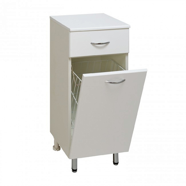 Полу-пенал напольный с одним выдвижным ящиком и откидным фасадом. Нижнее отделение комплектуется одной внутренней полкой и корзиной для белья. Ящик - на шариковых направляющих, петли со встроенным доводчиком, ручки - 2шт, ножки хром - 2 шт, ножки пластик -2шт.