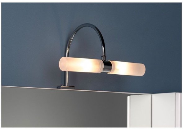 Светильник Aquanet 270 MT-G9002 выполнен в стиле «модерн» и относится к числу универсальных моделей. На изогнутом стержне крепится два цилиндрических вытянутых плафона из стекла, в которых установлены две лампы накаливания типа G9 по 40 Вт каждая. Крепится светильник к верхней части мебели на два самореза. Крепежи расположены на специально предусмотренной для них площадке. Светильник оборудован трансформатором, есть выходы для подключения к электросети.