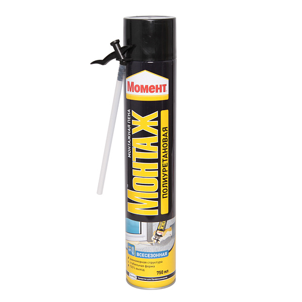 Монтажная пена Момент Монтаж Всесезонная Стандартная представляет собой готовую к применению однокомпонентную полиуретановую пену, затвердевающую под воздействием влажности воздуха. Применяется при температуре воздуха до -10оС.
