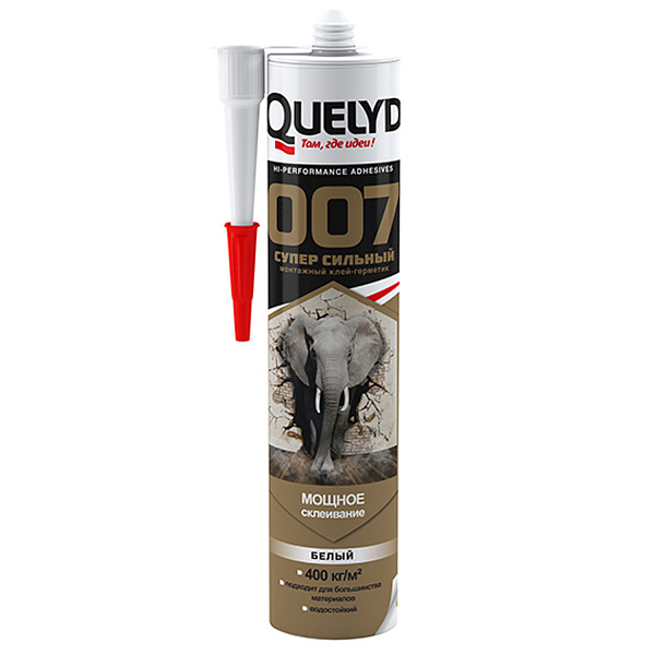Quelyd 007 «Супер сильный» специально разработан, как универсальный монтажный клей-герметик для соединения множества типов строительных материалов, таких как: камень, бетон, зеркала, стекло, гипсокартон, полиуретан, ПВХ, твердые пластики, эмалированные поверхности, керамика, медь, свинец, цинк, олово, алюминий, металлы (в том числе сплавы), нержавеющая сталь, HPL панели и цементные фибропанели*, дерево и т.д.