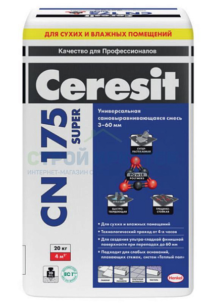 Ceresit CN 175 — смесь для выравнивания основания пола под последующую укладку покрытия. Представляет собой самовыравнивающуюся смесь подходящую как для ручного, так и для механического нанесения. Возможно нанесение в один слой, при этом толщина слоя для стяжки должна быть не менее 20 мм. На готовое основание можно стелить ламинат, паркет, линолеум, керамогранит и т.д. Смесь также подойдет для ремонта небольших дефектов пола: сколов, трещен.